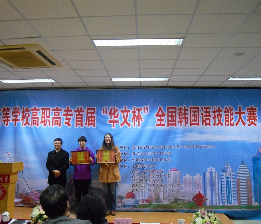 2012年11月4日,全国首届高职高专韩国语技能大赛在青岛大学举行。本次大赛由教育部高等学校高职高专其他语言类专业教学指导委员会主办。我院国际商务外语系应用韩语专业参赛团队的团体短剧荣获了全国一等奖。