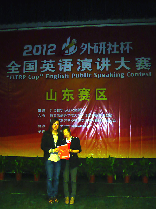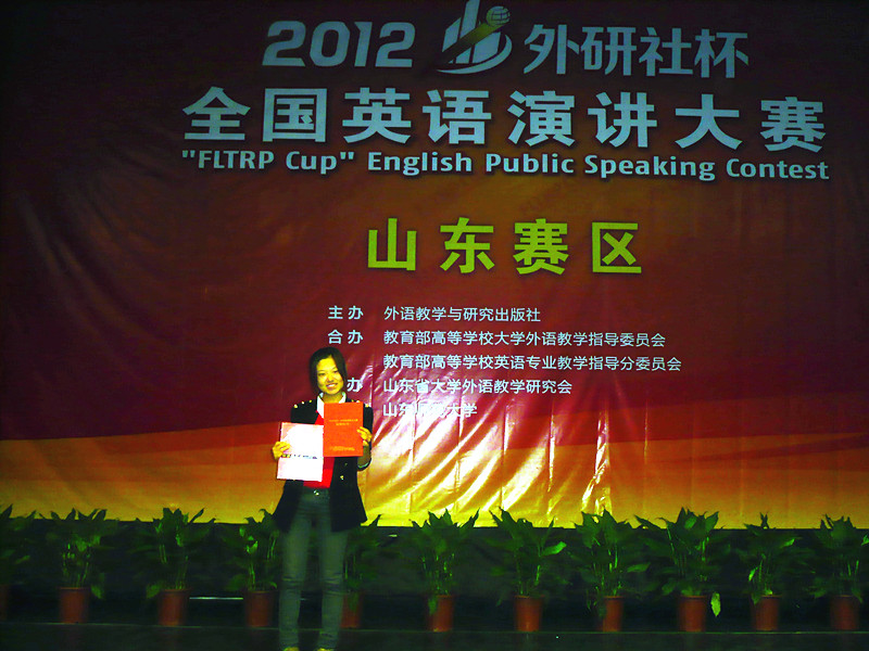 10月20日,我院国际商务外语系2011级商务英语专业学生迟琳慧喜获2012年度“外研社杯”英语演讲比赛山东省二等奖,冯敏喜获优秀教师指导奖。