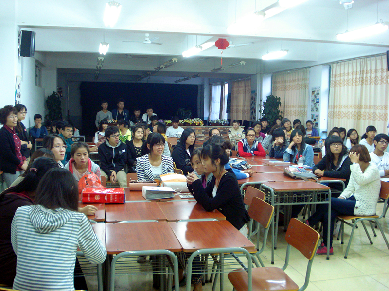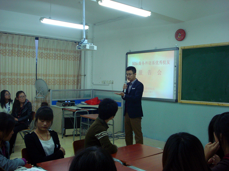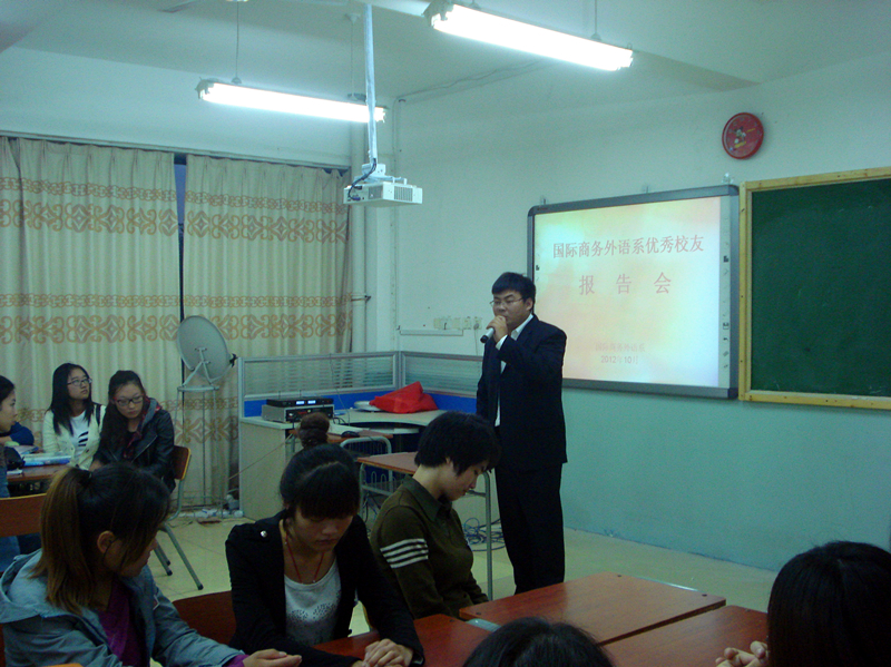 10月10日下午,国际商务外语系在D209教室举办了一场优秀校友报告会。本系2003级应用韩语专业学生杨东、李新军做了主题报告。教学服务科科长王海梅、招生就业科科长郭广利、应用韩语专业教师王亚前、张明参加了报告会。本系部分学生聆听了此次报告。