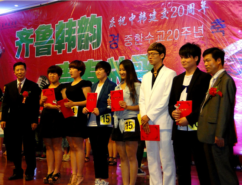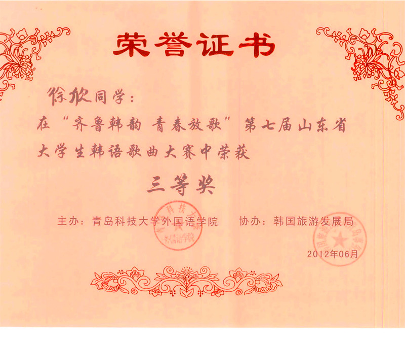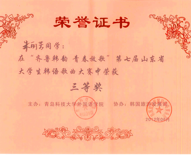 本次大赛由韩国旅游发展局主办,韩国鲜文大学协办,青岛科技大学承办,来自全省40所高校(本专科同组)的56名选手参加了比赛。大赛评审团由外籍教师、企业专家、高校资深教授组成。在40进20的半决赛“无伴奏清唱”中,朱丽芳、徐欣组合以预赛第4名的成绩轻松进入决赛。在激烈的决赛中,凭着优异的表现,最终以决赛第6名的成绩获得大赛三等奖(大赛共设一等奖1名;二等奖2名;三等奖3名),张璐获优秀指导教师奖。今年暑假期间,获奖选手朱丽芳、徐欣及指导教师张璐老师,将获得免费赴韩国进行文化体验的机会。