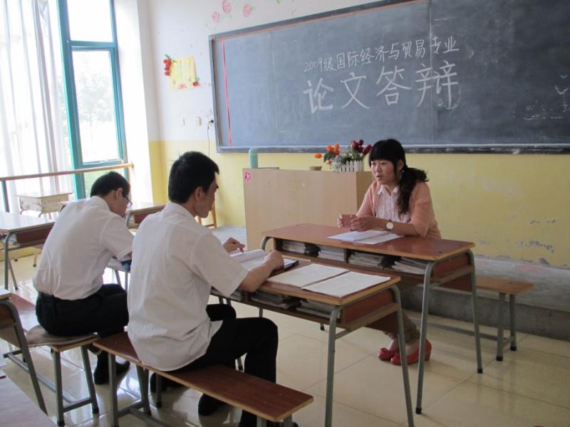 商务英语、应用俄语、商务日语、应用韩语和国际经济与贸易等五个专业,根据学生人数组成了7个答辩小组,每组2-3名专业教师,分别在7个答辩室同时进行。