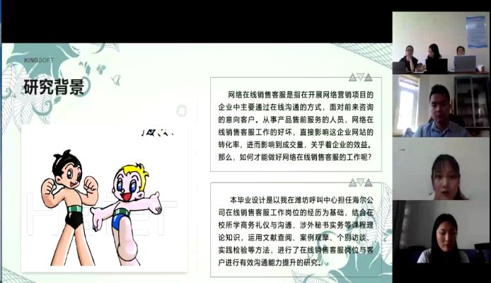 线上答辩期间,学生与答辩评委进行实时互动交流,学生通过PPT进行汇报,评委依次提问并给出中肯意见,最终给出公平评判。评委们所提的问题,除了与毕业设计本身有关问题之外,还结合学生实习岗位工作,引导学生给出了涉及学校课程设置、教学模式及学生素养等方面的意见或建议。答辩评委和学生均表示本次线上答辩过程组织严谨、流程规范,答辩氛围既严肃又友好,给学生留下了美好的回忆。