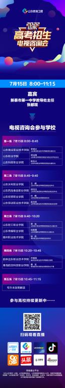 关注山东高考一点通、山东教育电视台、山东教育新闻微信公众号、视频号观看直播,或搜索“山东教育卫视”抖音号、快手号、新浪微博、头条号、百家号等平台收看直播,也可登录新浪新闻客户端观看节目。