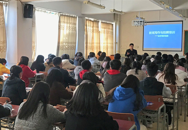 3月15日下午,商务外语系组织90名学生干部在博学楼D209教室进行“新闻写作与摄影能力提升”训练,党总支书记担任主讲。