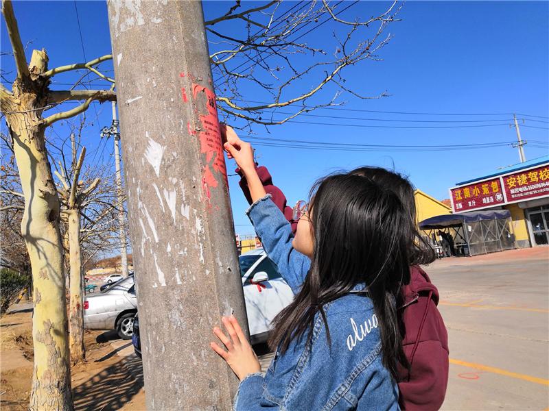 卫生清理分为两个区域,其中一个区域是龙兴湖周边,活动内容是清理垃圾。同学们带着手套,拿着垃圾袋,不停地弯下腰捡垃圾,在大家的齐心协力下,散落在湖边周围区域的废弃物变成了同学们的“俘虏”。另一个区域是学院南门附近,活动内容是去除小广告。同学们拿着铲,提着桶,先用水打湿小广告,然后用铲子一点一点地去除小广告,直到把小广告彻底清理干净。