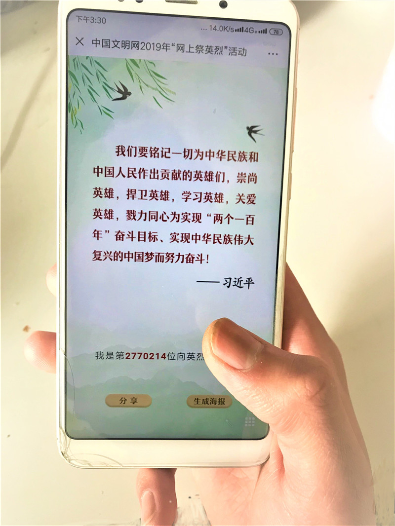 学生科科长组织同学们通过电脑或手机登陆中国文明网“2019网上祭英烈”专题,在祭英烈活动网页,同学们向先烈发送寄语,鞠躬敬献花圈,表达对先烈英灵的怀缅与崇敬。活动中,同学们更加深刻体会到先烈们为祖国、为人民坚贞不屈、英勇无畏的高贵品质和革命精神。同学们在祭奠英烈中慎终追远、缅怀先辈,铭记革命先烈的光荣事迹,传承英烈精神。