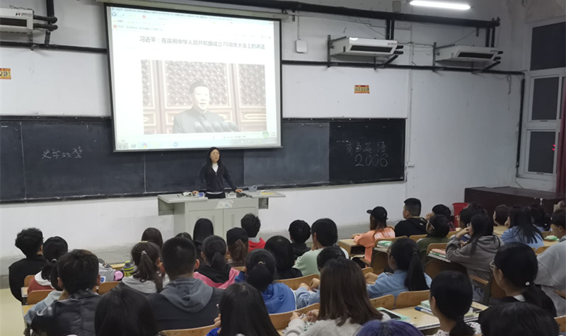团课由商务外语系团总支书记担任主讲,内容分为两部分。首先,团总支书记用中华人民共和国成立70周年阅兵式现场的精彩片段视频,重点讲述了习近平总书记在大会上讲话的深刻含义。第二部分,团总支书记借助PPT,结合《我和我的祖国》电影中的部分场景,通过讲述我国70年来的大事件,让同学们体会70年祖国发展的光辉历程,感悟中国共产党人不忘初心、砥砺前行的奋斗精神。