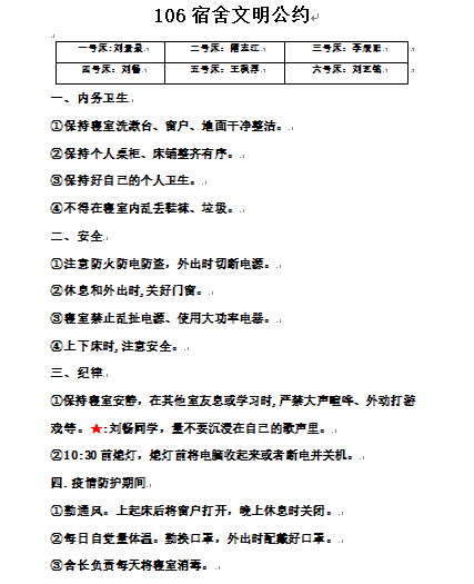 宿舍文明公约需要健康,阳光,向上,体现文明,互助,和谐,守规元素。学生们积极响应号召,以不同的方式展现了自身宿舍文明公约,扣紧了主题,将幽默,风趣和各种时尚元素结合到了合约中,宿舍每个人都参与其中,签字遵守。以做到按时就寝,学习监督,作息娱乐等内容。