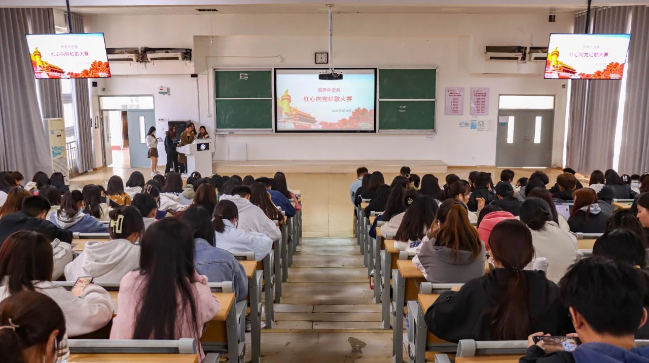 3月26日下午,商务外语系开展“红心向党 红歌大赛”,学生党支部党员教师、系党的基础知识培训班全体学员参加。
