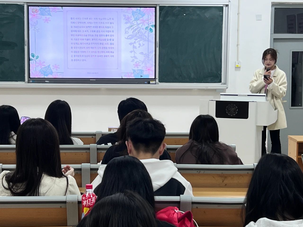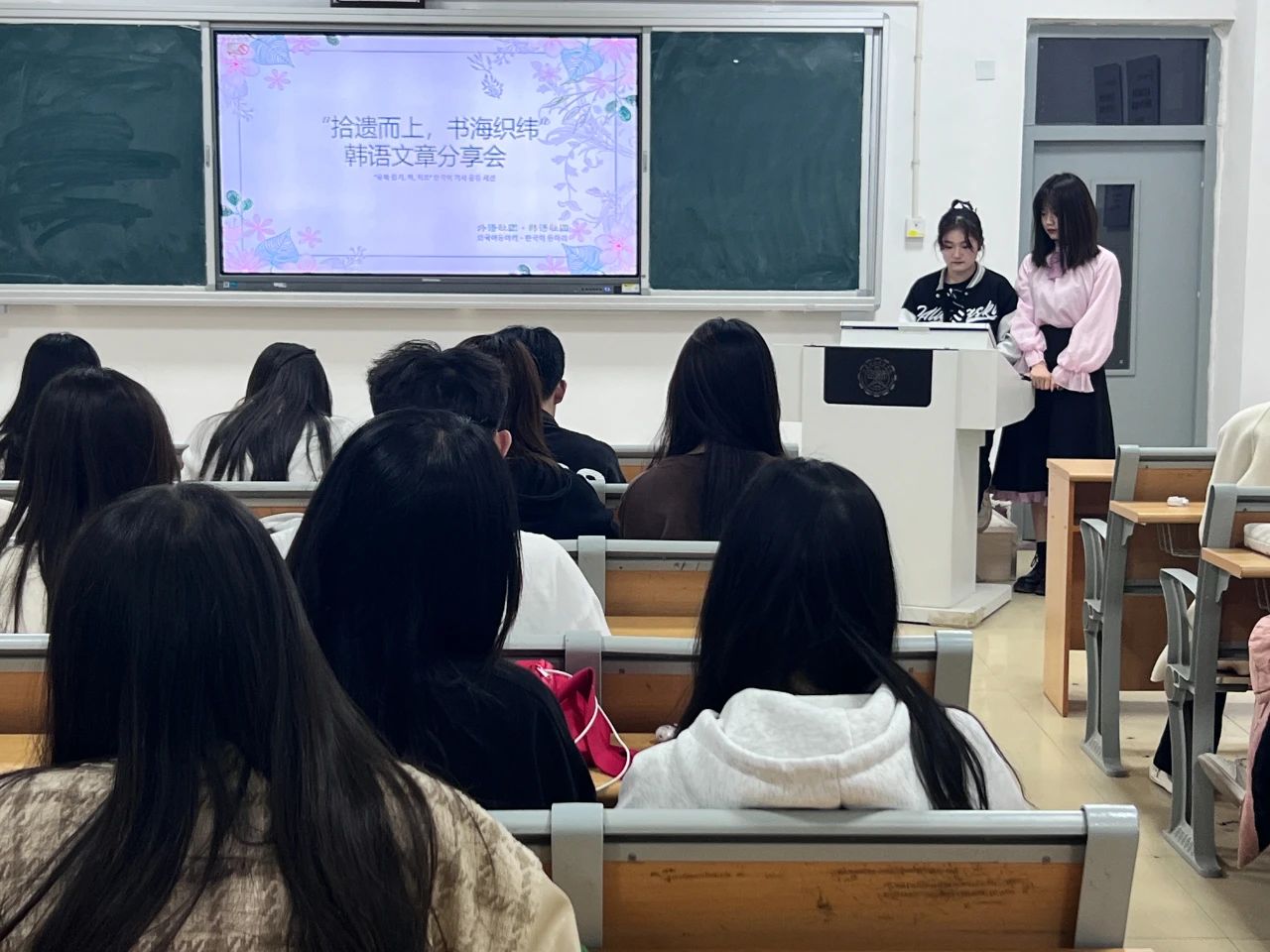 为帮助同学们丰富校园生活、提高韩语水平、深入了解中华优秀传统文化,3月30日晚,外语社团·撒浪嘿韩语社团于博学楼C202教室举办“拾遗而上,书海织纬”韩语文章分享会活动。