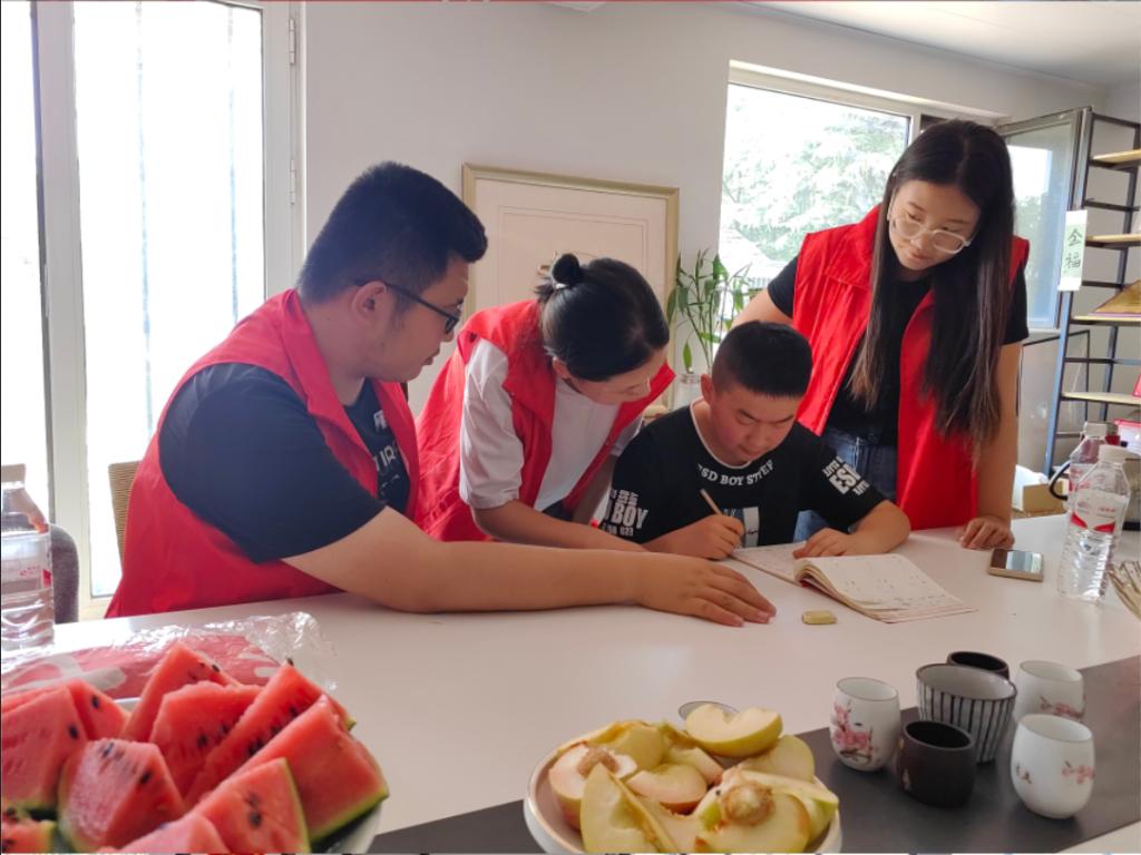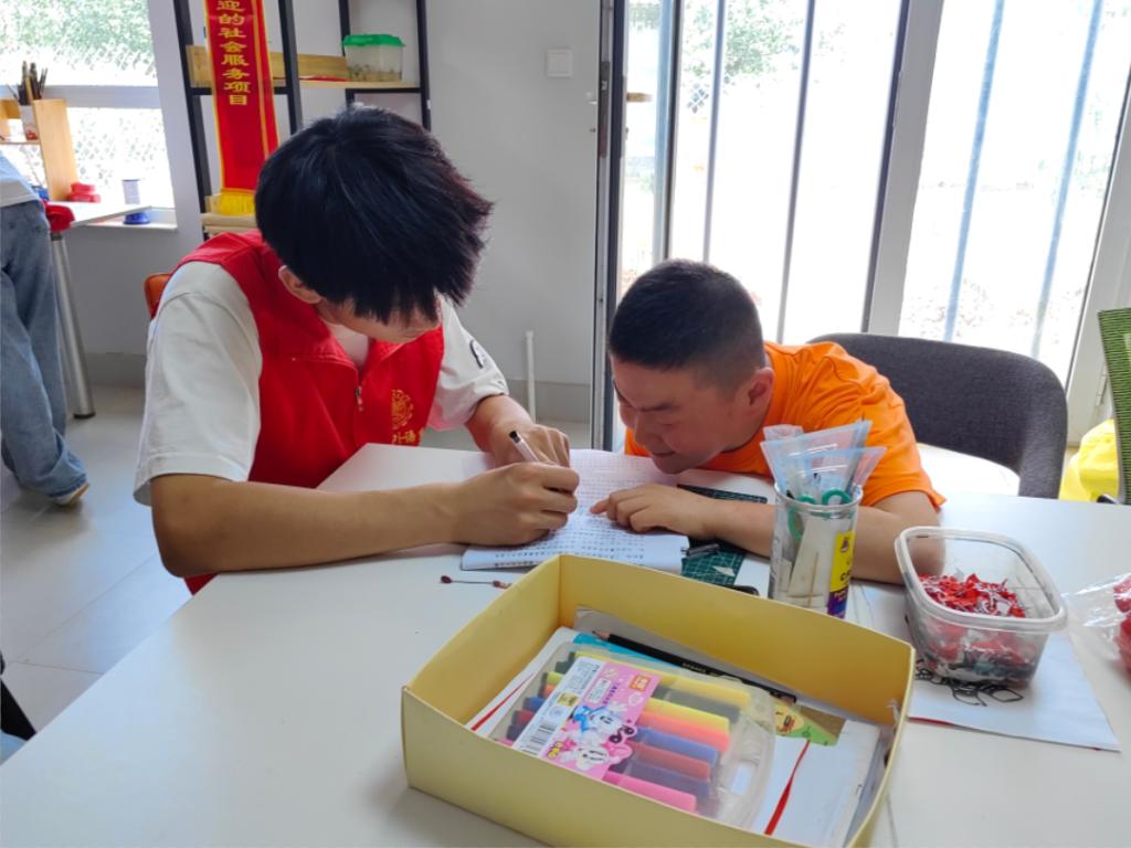 每天一早,志愿者们来到公益服务中心,与心智障碍残疾人士谈心交流,询问他们近期心情、饮食和睡眠等情况;同时,志愿者们与他们共同参与击鼓传花、捉迷藏、丢手绢等趣味小游戏,让他们切实感受到温暖的陪伴。为了丰富心智障碍残疾人的日常生活,志愿者们组织剪纸、绘画、绘本阅读等活动,并引导他们学习简单的数学知识,对他们提出的问题认真解答,帮助他们开拓思维,有所收获。接着,志愿者们进行了健康知识宣讲,帮助心智障碍残疾人了解个人卫生知识、学习预防溺水技能,组织他们开展广播体操、踢毽子、跳绳等体育锻炼活动,帮助他们强健体魄、增强身体素质。为了给心智障碍残疾人士营造舒适整洁的生活和学习环境,志愿者帮助他们叠被子、整理房间,并对教室及室外活动场进行卫生清扫,以实际行动传递着爱心。