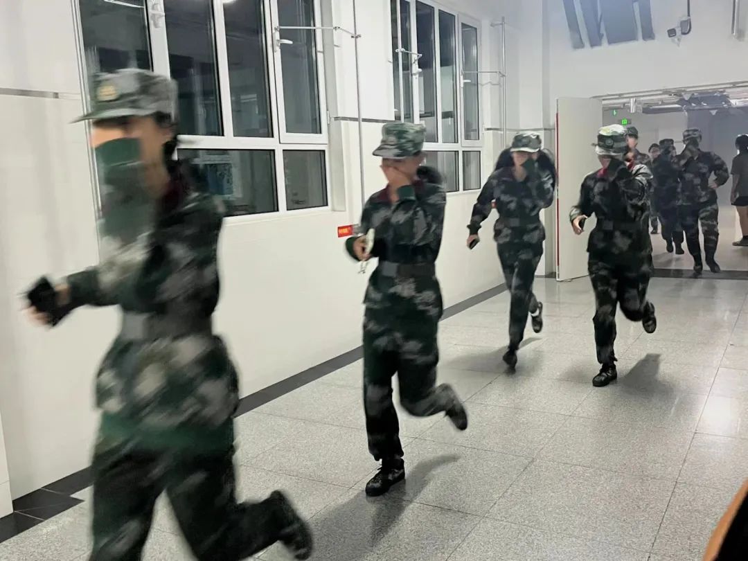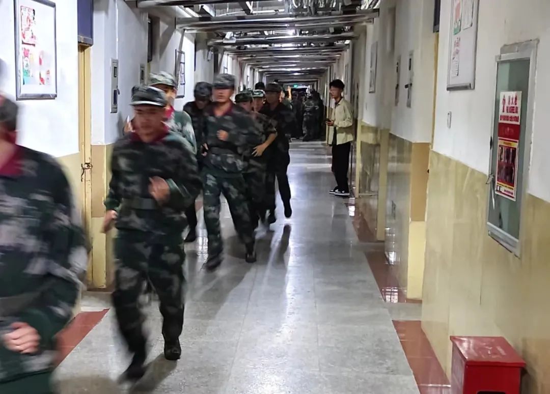 下午19:00,警报响起,同学们按照要求弯腰、护头,沿规定路线有序向指定地点撤离。