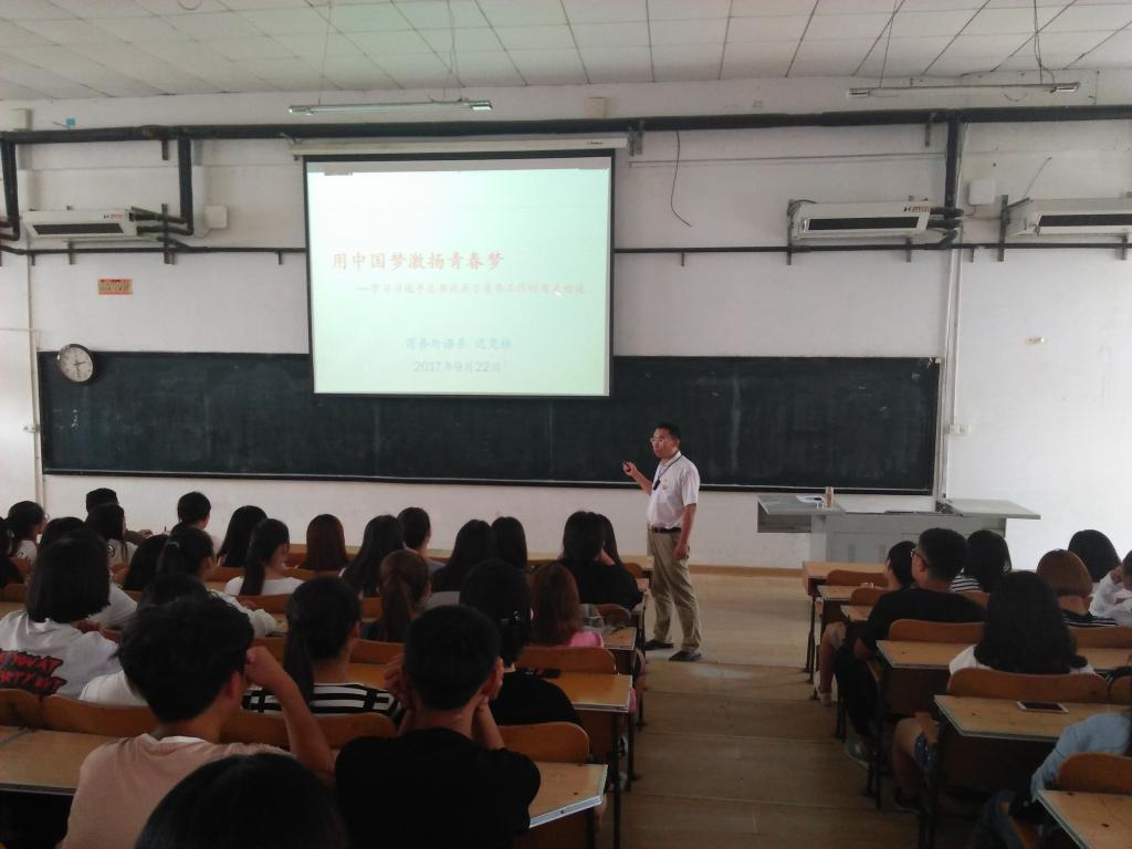 9月22日下午在博学楼C205教室,商务外语系党支部书记迟尧林主任以《用中国梦激扬青春梦》为题,为2017级新生们上了内容丰富、趣味盎然而又充满哲理与思辨的“开学第一课”,支部部分党员、辅导员以及2017级280名同学参加了本次活动。