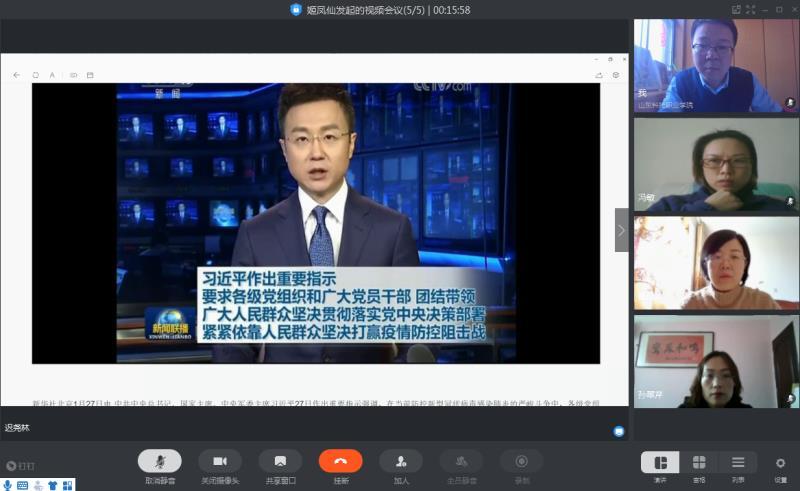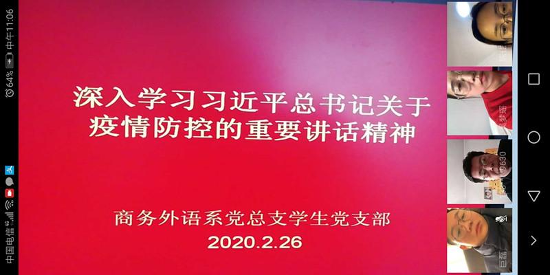 商务外语系党总支按照学院党委工作部署,认真贯彻落实相关工作要求,于2月26日组织教师党支部和学生党支部分别通过钉钉办公、学习强国视频会议平台开展“让党旗在疫情斗争第一线高高飘扬”主题党日活动,全体教职工党员、学生预备党员和部分入党积极分子参加。