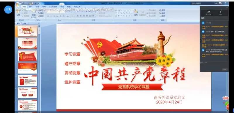 4月25日下午,商务外语系党支部在钉钉平台开展了“中共山东科技职业学院委员会党校2020年度第七期入党积极分子培训”第一课,参加此次课程的有2018级学生入党积极分子和教师入党积极分子。