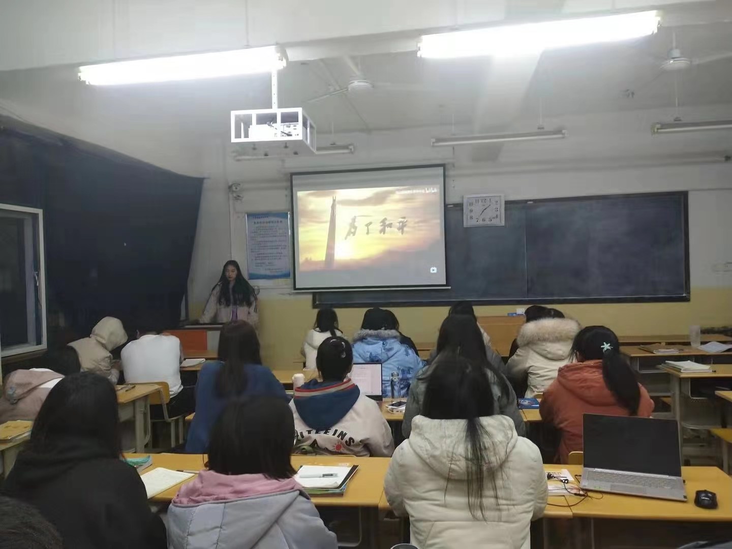 12月25日,商务外语系组织宣传部组织商务外语系全体学生在c203观看大型电视纪录片《为了和平》,由组织宣传部顾文昕担任主讲。